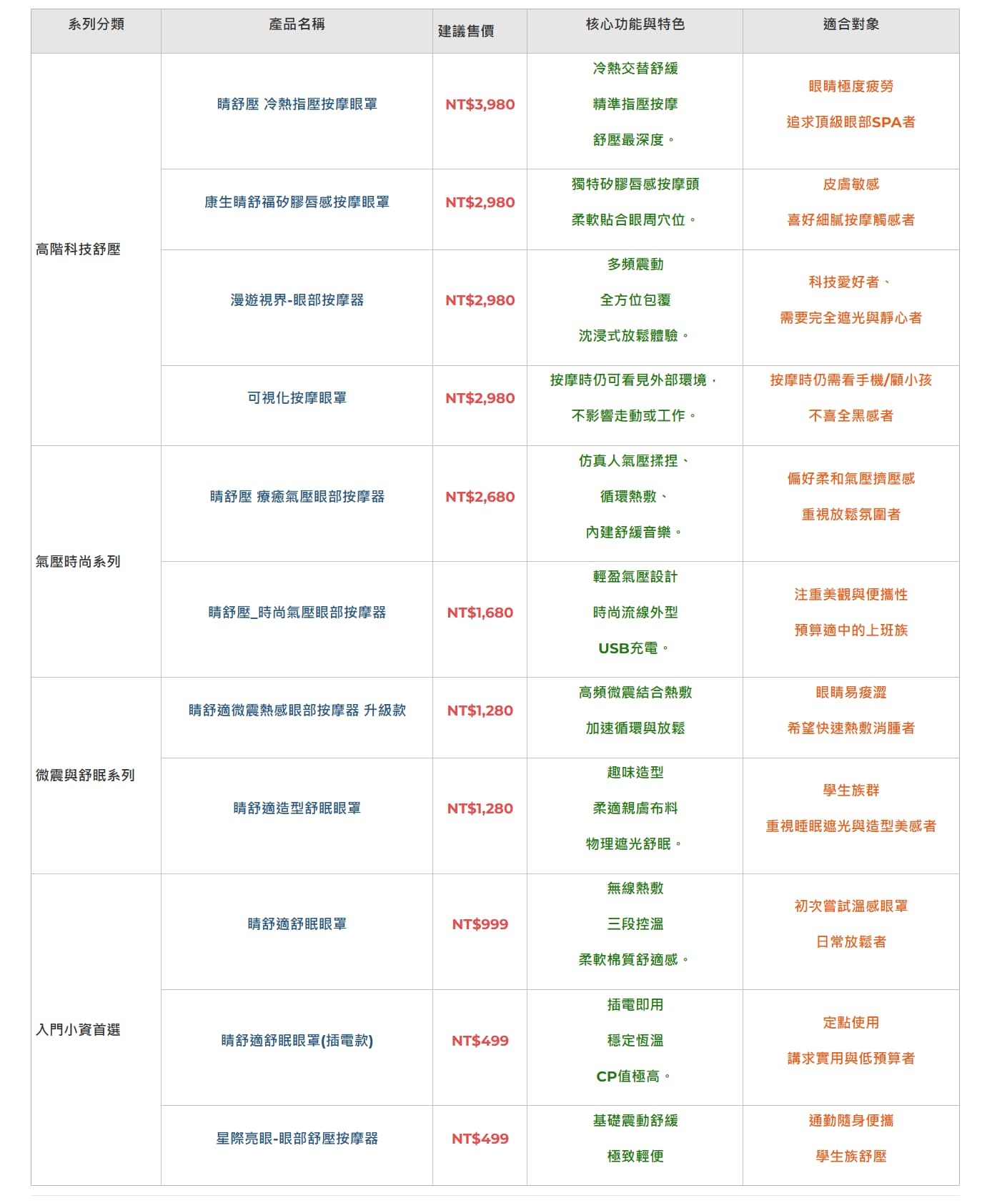 涵蓋熱敷、震動及智能功能,